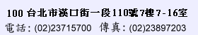 100 台北市漢口街一段 110 號 7 樓 7-16 室 (漢口大廈7F 電梯出口左邊)
